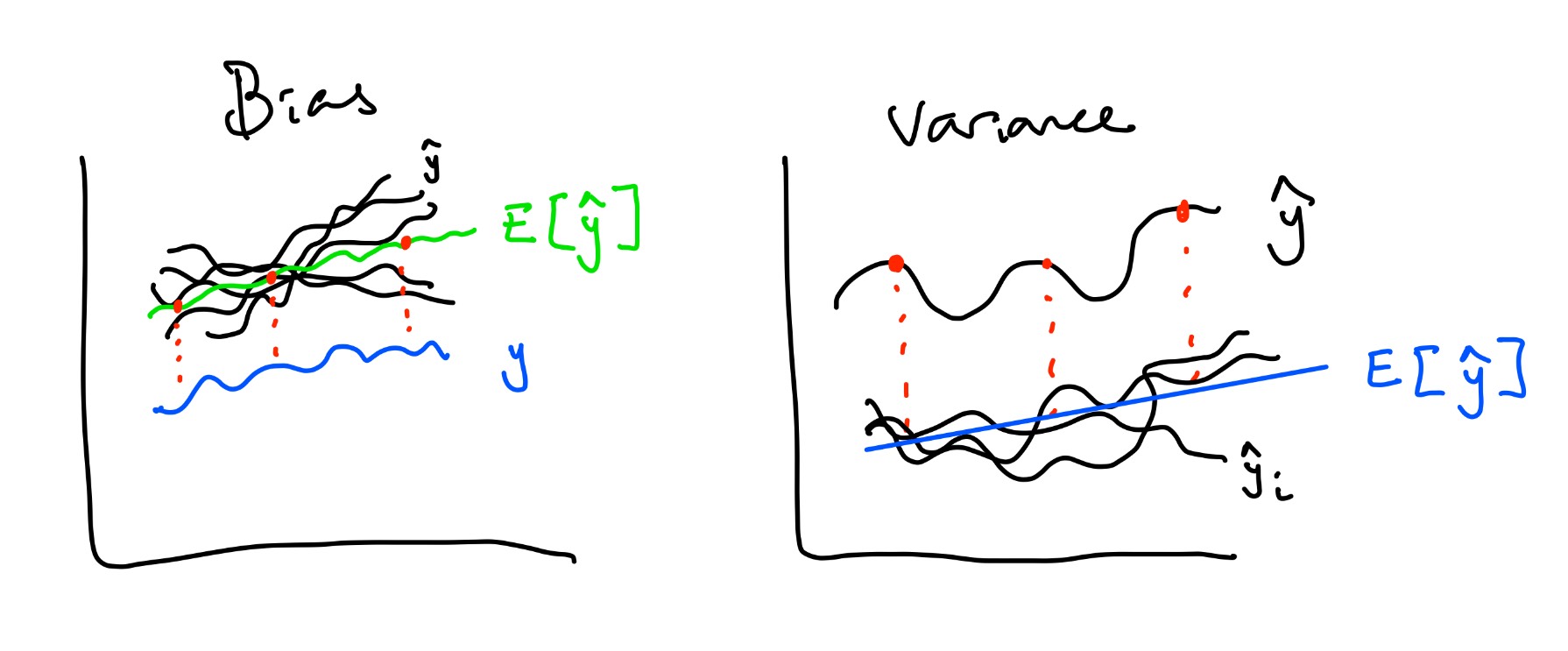 | $y - \mathbb{E}[\hat{y}]$ | Bias | How far is actual $y$ from average predicted $y$? |