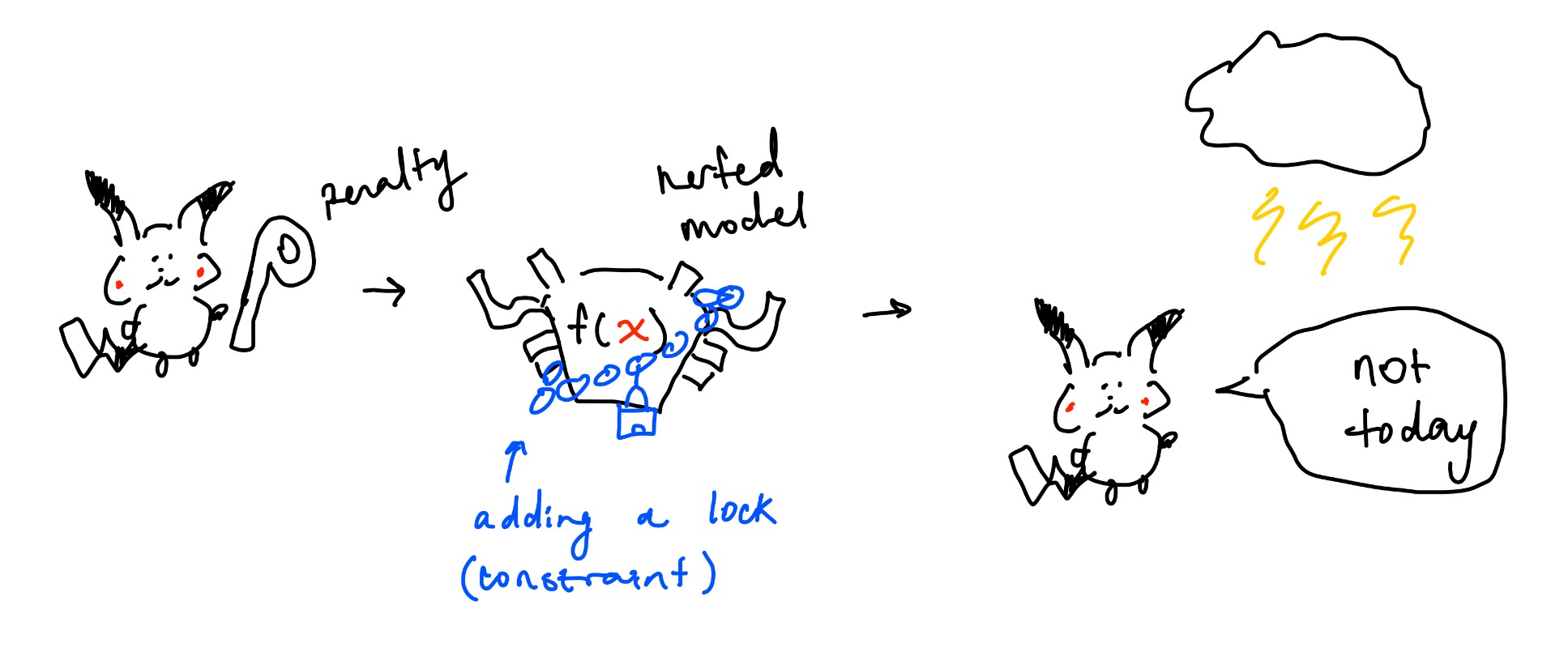 So how do we prevent overfitting? Use a regularization or penalty term. Earlier, Pikachu overfit to past data, making future predictions useless. By introducing higher error, we make our model more generalizable across new datapoints.