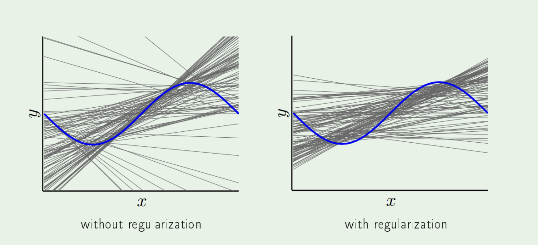 So what does this mean? We are restricting our model. By increasing bias (more distance between $y$ and $\hat{y}$), we reduce the model's ability to match the true relationship. Since bias is sqaured, variance will drop a lot, meaning the model will become more stable. What does that mean intuitively?